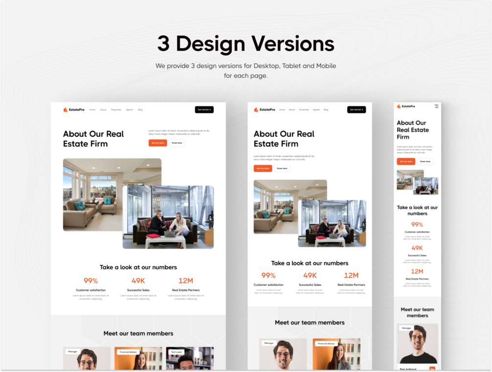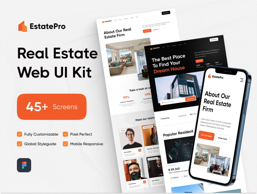With over 45 pixel-perfect screens, a global style guide, mobile responsiveness, organized layers, and easily customizable components, EstatePro is the perfect tool to streamline your real estate website design process.