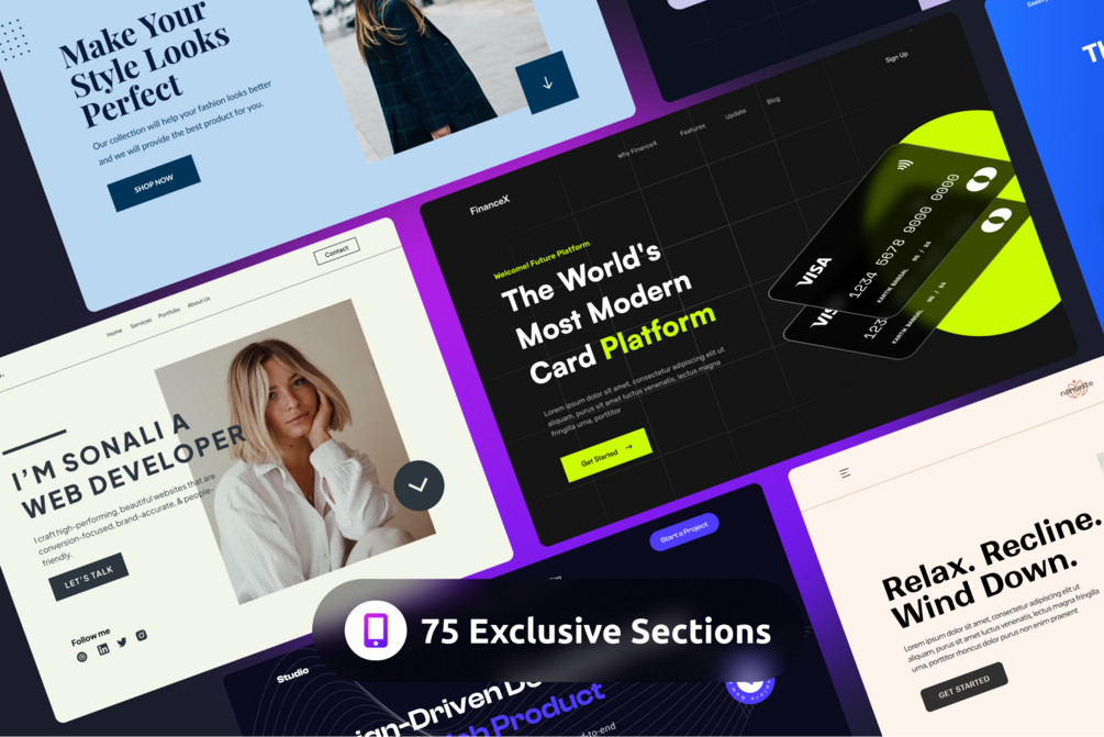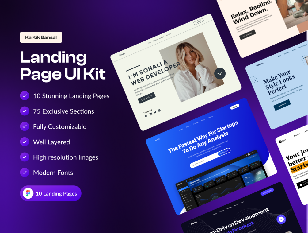 Tired of wasting thousands of hours starting from scratch on every project and rebuilding the same components? Landing page UI Kit comes packed with 10 premium landing pages with 75 exclusive sections so you can design landing pages in minutes.